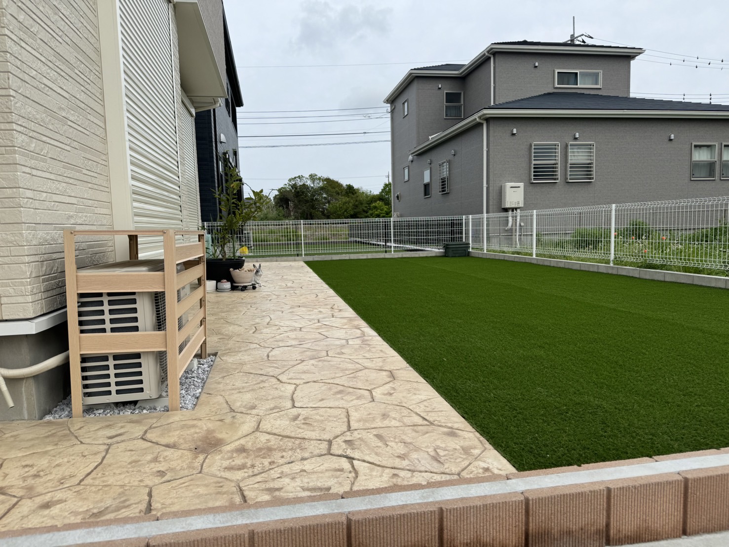 戸建て住宅にて、スタンプコンクリート・人工芝の施工を行ないましたので、ご紹介いたします。 建物の雰囲気にもマッチした、きれいな仕上がりとなりました!